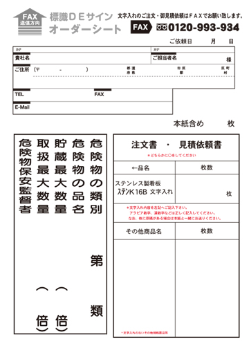 明治山上げ加工とは 明治山上げ加工とは、周囲フチが平らでそこから山のように盛り上がり板面をまた平にした加工をいいます。 承認図あり 必要な場合承認図をご用意できます。 文字入れ加工(切文字ステッカー) 上記看板文字入れも承ります。 お値段の目安は1文字200円、 20文字~40文字一律 名入れ代¥4,000円、 40文字以上につきましては1文字100円で計算してください。 ご注文・見積依頼は下記オーダーシートをFAXでお願いします。 文字入れオーダーシート FAXでのご注文.御見積の場合は、オーダーシートをご利用ください。