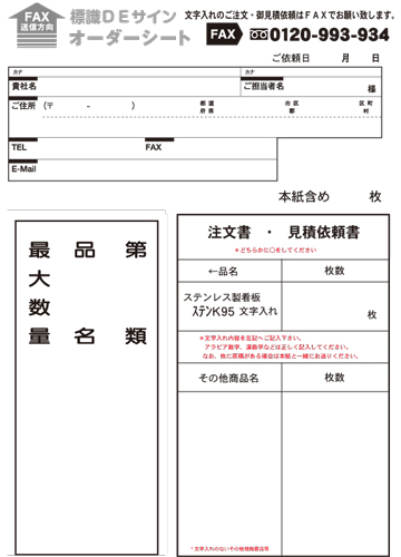 明治山上げ加工とは 明治山上げ加工とは、周囲フチが平らでそこから山のように盛り上がり板面をまた平にした加工をいいます。 承認図あり 必要な場合承認図をご用意できます。 文字入れ加工(切文字ステッカー) 上記看板文字入れも承ります。 お値段の目安は1文字200円、 20文字~40文字一律 名入れ代¥4,000円、 40文字以上につきましては1文字100円で計算してください。 ご注文・見積依頼は下記オーダーシートをFAXでお願いします。 文字入れオーダーシート FAXでのご注文.御見積の場合は、オーダーシートをご利用ください。