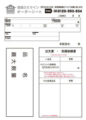明治山上げ加工とは 明治山上げ加工とは、周囲フチが平らでそこから山のように盛り上がり板面をまた平にした加工をいいます。 承認図あり 必要な場合承認図をご用意できます。 文字入れ加工(切文字ステッカー) 上記看板文字入れも承ります。 お値段の目安は1文字200円、 20文字~40文字一律 名入れ代¥4,000円、 40文字以上につきましては1文字100円で計算してください。 ご注文・見積依頼は下記オーダーシートをFAXでお願いします。 文字入れオーダーシート FAXでのご注文.御見積の場合は、オーダーシートをご利用ください。
