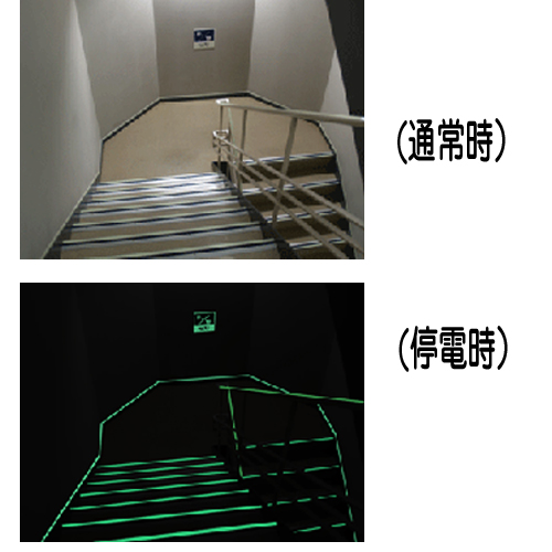 直接電気エネルギーを使用せず照明光や太陽光を蓄えて暗闇においても明るく光る「蓄光顔料」を用いた製品を適所に設置して、それらを個々の「 点 」ではなく「 線 」で結ぶことにより、 災害停電時 にも人々が瞬時に避難路を視認確保する事が出来、大勢の人々を速やかに避難誘導出来るシステムです。