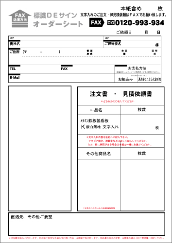 文字入れ加工(切文字ステッカー) 上記看板文字入れも承ります。 お値段の目安は1文字200円、 20文字~40文字一律 名入れ代¥4,000円、 40文字以上につきましては1文字100円で計算してください。 ご注文・見積依頼は下記オーダーシートをFAXでお願いします。 文字入れオーダーシート FAXでのご注文.御見積の場合は、