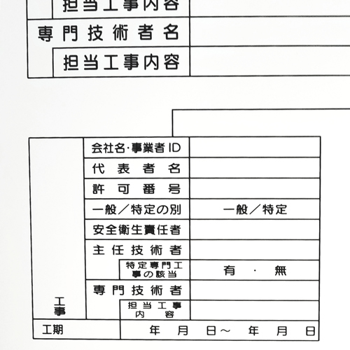 2021年 4月 施工体系図の改定 2020年10月に 「建設業法施行規則及び施工技術検定規則の一部を改正する 省令」が施行されました。 これにより標識の掲示義務が緩和されたのですが、 一方で 施工体系図に記載しなければならない内容が追加されました。 具体的には、 「代表者の氏名」、 「一般建設業又は特定建設業の別」、「許可番号」、「特定専門工事の該当の有無」、「監理技術者補佐」 の項目が追加されております。 2021年4月以降は改定された施工体系図が使われることとなりました。 下記の青い文字をクリックすると改訂版 施工体系図 商品一覧です。ご参考にして下さい。 建設業法第40条(標識の掲示) 建設業法第40条(標識の掲示) ○ 現場に掲げる建設業許可票の掲示義務を元請のみとする。 ○ 一方、 下請にどのような会社が入っているかを引き続き明らかにする必要があることから、施工体系図の記載事項を改正。 第四十条(標識の掲示) 建設業者は、その店舗及び建設工事 (発注者から直接請け負ったものに限る。)の現場ごとに、公衆の見や すい場所に、国土交通省令の定めるところにより、 許可を受けた別表第一の下欄の区分による建設業の名称、 一般建 設業又は特定建設業の別その他国土交通省令で定める事項を記載した標識を掲げなければならない。 上記のことより新しい施工体系図を掲げれば、建設業の許可票は 元請業者のみで良くなり下請業者(一次、二次を含み)の掲載義務はなくなりました。 硬質樹脂 ポリプロピレンとは 一般的に「プラスチック」と言われるなかの一つで 比較的耐熱・耐冷・耐薬品・耐アルカリ性、絶縁性が高く強い、硬質プラスチック 耐水性、耐久性、にも優れ、衝撃に強くコシがあり割れにくい材質です。 屋内外に使用する標示板に最適な材料です。