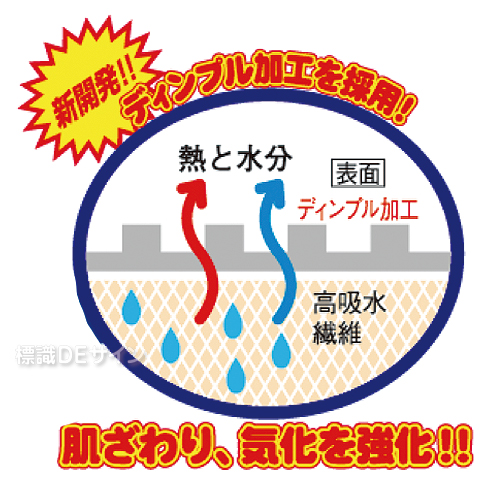 ④高吸水繊維の気化を助長させるデインプル加工の特殊な編み方をした生地を表面に使い、爽快感を持続させます