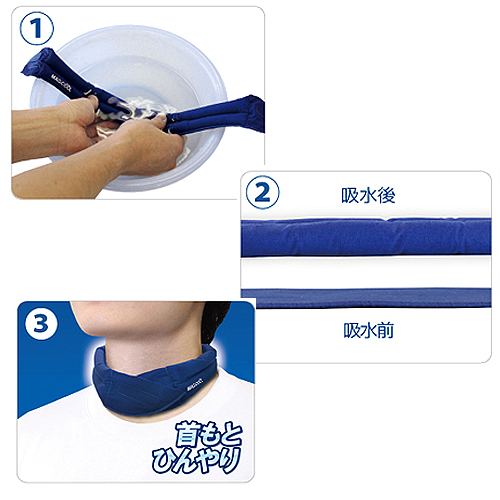 ●「マジクール」(通しホールタイプ)。水を含ませるだけで冷感が持続するネッククーラー