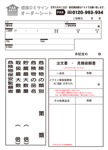 文字入れ加工(切文字ステッカー) 上記看板文字入れも承ります。 お値段の目安は1文字200円、 20文字~40文字一律 名入れ代¥4,000円、 40文字以上につきましては1文字100円で計算してください。 ご注文・見積依頼は下記オーダーシートをFAXでお願いします。 文字入れオーダーシート FAXでのご注文.御見積の場合は、
