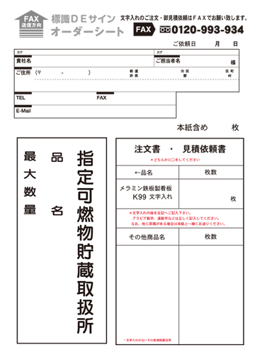 K99 鉄板製標識 「指定可燃物貯蔵取扱所+品名+最大数量」