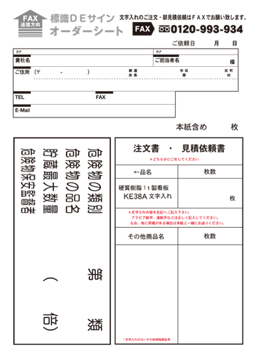 文字入れ加工(切文字ステッカー) 上記看板文字入れも承ります。 お値段の目安は1文字200円、 20文字~40文字一律 名入れ代¥4,000円、 40文字以上につきましては1文字100円で計算してください。 ご注文・見積依頼は下記オーダーシートをFAXでお願いします。 文字入れオーダーシート FAXでのご注文.御見積の場合は、