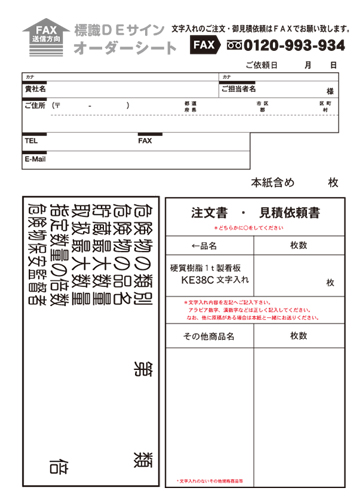 文字入れ加工(切文字ステッカー) 上記看板文字入れも承ります。 お値段の目安は1文字200円、 20文字~40文字一律 名入れ代¥4,000円、 40文字以上につきましては1文字100円で計算してください。 ご注文・見積依頼は下記オーダーシートをFAXでお願いします。 文字入れオーダーシート FAXでのご注文.御見積の場合は、