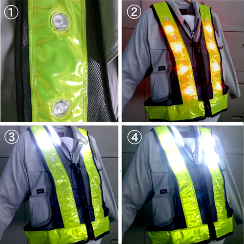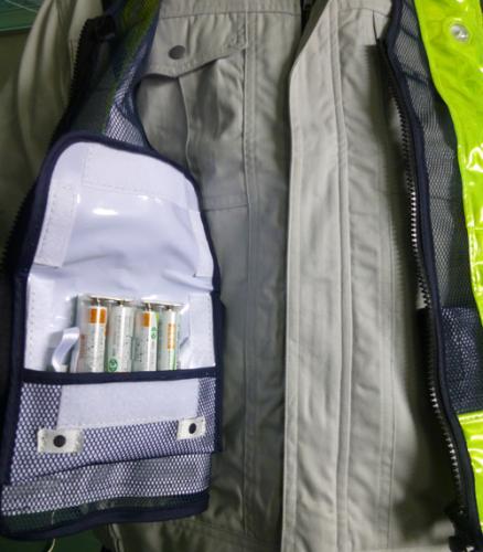 電源と電池ボックス図 電源: 単三アルカリ乾電池×8本 (*商品に電池は付属してません) 作業灯: 2灯使用時 約16時間使用可 4灯使用時 約8時間使用可 重量:約730g (単三電池8本含む) *図のように左右に電池BOX(4個用)が付属してます。 頭に付けるヘッドランプに比べたら着用するものなので重さはあまり気になりません。 また電池BOXの下にある黒い点がON、OFFと切替スイッチになります。 3段階の切替が可能です。 ①は作業灯の画像・・・縦に2個づつ左右で4個装備してます。 ②はLED警告灯赤(黄)の点滅で、作業者がいることを警告します。 ③は作業灯1灯のみ(左右で2灯)を点灯した状態 ④は作業灯2灯のみ(左右で4灯)を点灯した状態 作業灯はLED警告灯点滅を使用した状態でも使用しない状態でも使用可能です。 作業灯の明るさ ①は暗闇で2灯(左右4灯)使用した状態で十分新聞も読めます。 ②は暗闇で3mはなれたコーンを撮影しました。 ③は、②の状態で1灯(左右2灯)使用した状態 ④は、②の状態で2灯(左右4灯)使用した状態 手元を照らすには十分な明るさがあります。 安全ベスト名入承ります。 FAXのみで名入れ御見積・ご注文を受け付けております。 FAXでの.御見積ご注文の場合は、オーダーシートをご利用ください。