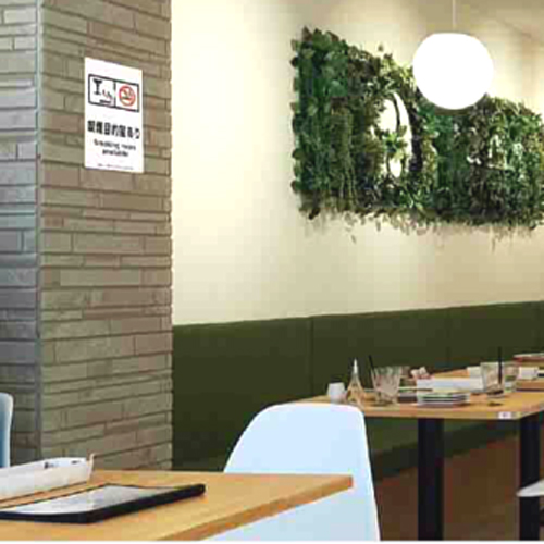 加熱式たばこ専用の喫煙室がある店舗には店の入り口に標識を掲示し、加熱式たばこ専用喫煙室のの見やすい場所にも標識を掲示します。。紙巻たばこはこのなかで吸えません。また、この部屋のなかでは喫煙だけでなく、飲食なども可能です。