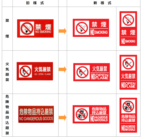 東京消防庁 禁止行為の標識 映画館、劇場や百貨店などの大勢の人が訪れる建物では、 火災が起きると大きな災害になってしまいます。 東京消防庁では、火災予防条例第23条において、 不特定多数の人が出入りする 一定規模の場所で行われる 「喫煙」、「裸火使用」、「危険物品の持込」の行為を 禁止行為として規制しています。 また、禁止行為に応じた標識を、建物の入口など 見やすい箇所に設置しなければなりません。 そして、令和2年4月1日、火災予防条例施行規則が改定され、 禁止行為の標識 が新様式になります。 主な変更点として、 「危険物品持込厳禁」の標識に新たにピクトグラムが配置され、 従来の横型標識に加え縦型のデザインが追加されました。 また、標識の大きさについても従来の標識自体の大きさの規制ではなく、 シンボ ル部分及び文字部分の大きさを規定することで、 標識自体の大きさに柔軟性が 持たれました。 すでに設置されている旧様式の標識については継続使用できますが、 平成2年 4月1日以降の汚損や破壊等による標識の交換の場合などは、 新様式の設置が 義務となります。 東京消防庁ホームページ 一般社団法人 日本消防標識工業会自主管理合格品 総務省、消防庁、日本消防設備安全センター等に指導をうけ さまざまな消防標識の仕様、品質基準を研究し 自主管理体制を構築した組織で検査合格品の素材を使用し個別検査にも合格した各製品に認証マークを貼付させた。 それにより行政側も「信頼できる製品」として、使用を推奨していただけるようにしました。 日本消防標識工業会http://www.nissyohyo.com/